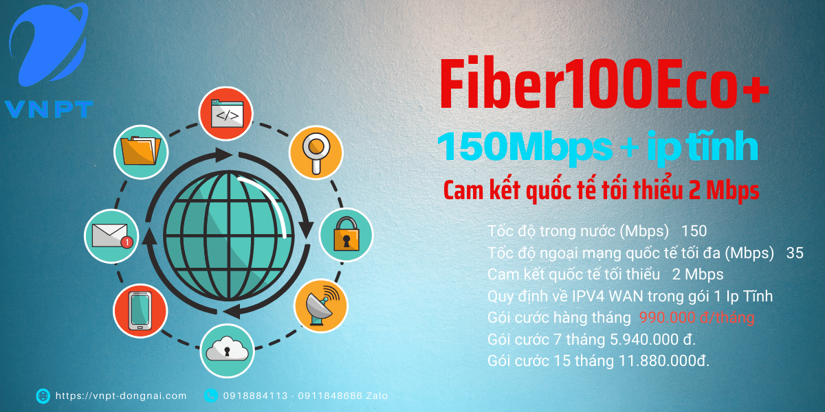 VNPT Đồng Nai xin giới thiệu đến khách hàng gói cước Internet Doanh Nghiệp Fiber100Eco+ 150Mbps 1 IP Tĩnh được nhiều khách hàng lựa chọn vì có chi phí vừa phải, tốc độ ổn định, được trang bị Ip tĩnh và được cam kết tốc độ quốc tế tối thiểu.
