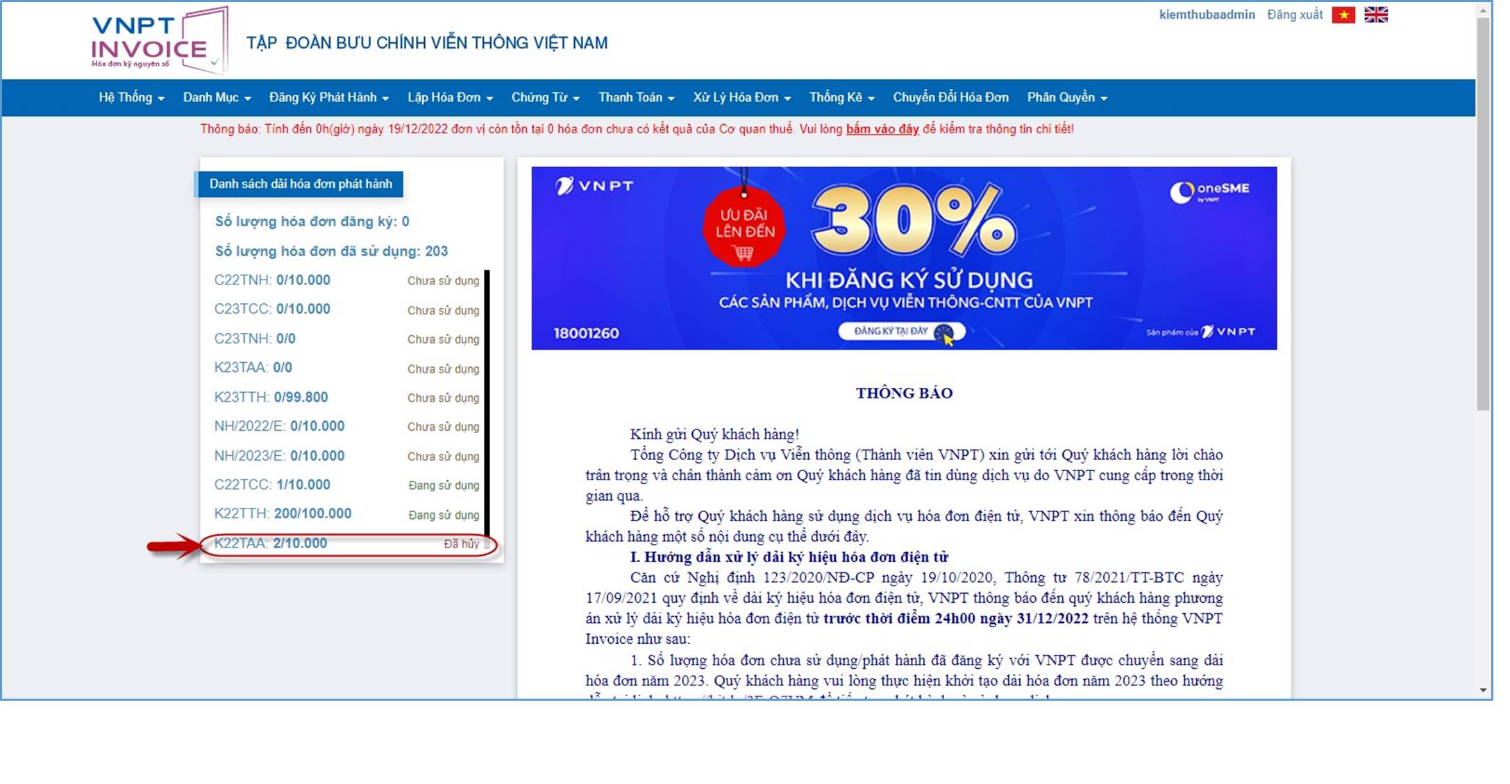 Hoặc ngay khi khách hàng đăng nhập vào trang web xuất hóa đơn của VNPT, Người sử dụng cũng có thể theo dõi được trạng thái dải hóa đơn đã đăng ký, đã hủy, số lượng hóa đơn đã sử dụng ... như ảnh minh họa bên dưới, Nếu khách hàng không thấy thông tin như ảnh, thì khách hàng thực hiện thoát khỏi trang web và đăng nhập lại.