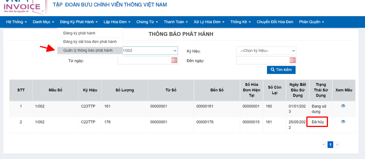 Bước 5: Kiểm tra lại thông tin dải hóa đơn đã thực hiện hủy