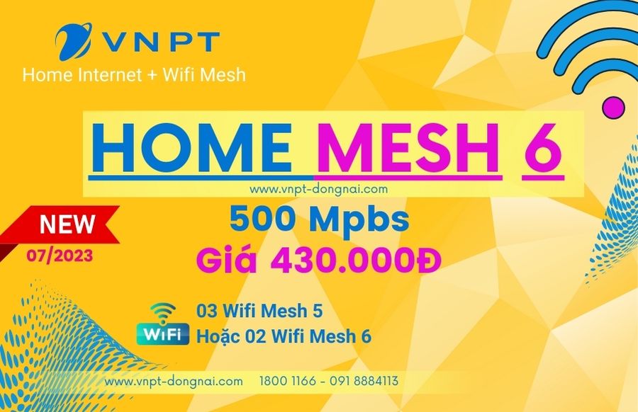 - Gói cước Mesh 6: Tốc độ truy cập 500 Mbps, 2 Mesh 5 hoặc 1 Mesh 6, giá cước hàng tháng 430.000 đồng.