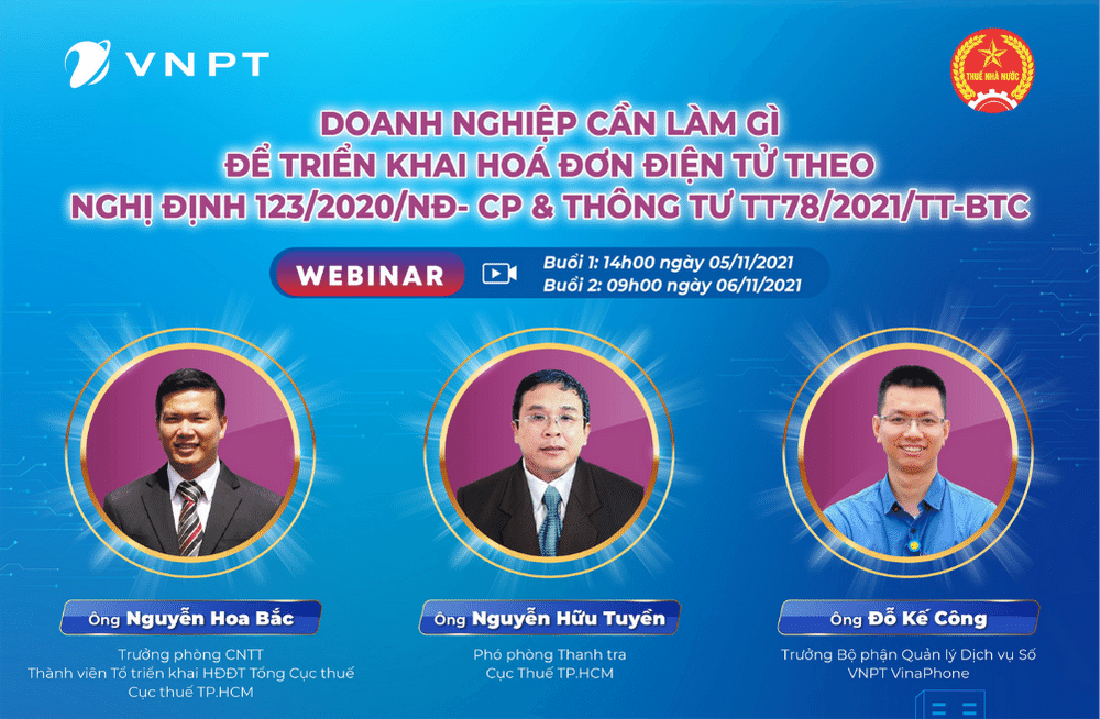 Nhằm hỗ trợ Tổ chức/Doanh nghiệp nhanh chóng tiếp cận và triển khai Hóa đơn điện tử theo Nghị định 123/2020/NĐ-CP và Thông tư 78/2021/TT-BTC theo đúng tiến độ và lộ trình của Bộ Tài Chính, Trung tâm Kinh doanh VNPT Thành phố Hồ Chí Minh (VNPT VinaPhone) phối hợp cùng Cục Thuế Thành phố Hồ Chí Minh tổ chức buổi hội thảo theo thông tin cụ thể như sau: